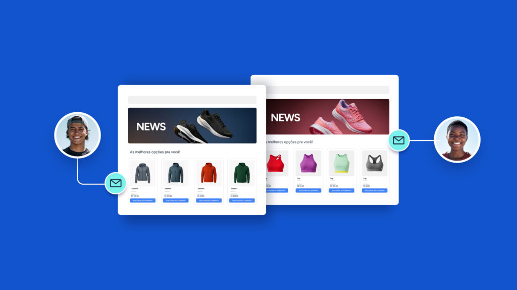 - Além disso, em campanhas de e-mail marketing, é possível exibir vitrines com produtos conectados à mensagem enviada. Quando o usuário chega ao e-commerce e encontra exatamente os itens apresentados no e-mail, a narrativa da campanha se mantém consistente e a chance de conversão aumenta.