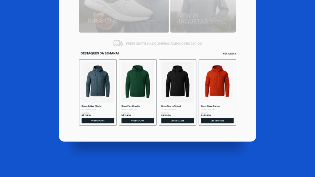 O design da vitrine também comunica a identidade do e-commerce. É um dos pontos visuais mais importantes da experiência de navegação.